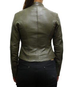 The Women’s Victoria Olive Green Leather Jacket is a perfect mix of boldness and elegance. Crafted from high-quality genuine leather, it features a streamlined biker design with a band collar and front zipper closure, giving it a modern edge. The zippered chest and waist pockets add both style and practicality, while the olive tone brings a refreshing twist to the classic biker look. The slim-fit tailoring complements the body shape beautifully, and the soft viscose lining ensures comfort in every season. Whether paired with denim or a dress, this olive green leather jacket for women adds instant sophistication to any outfit.